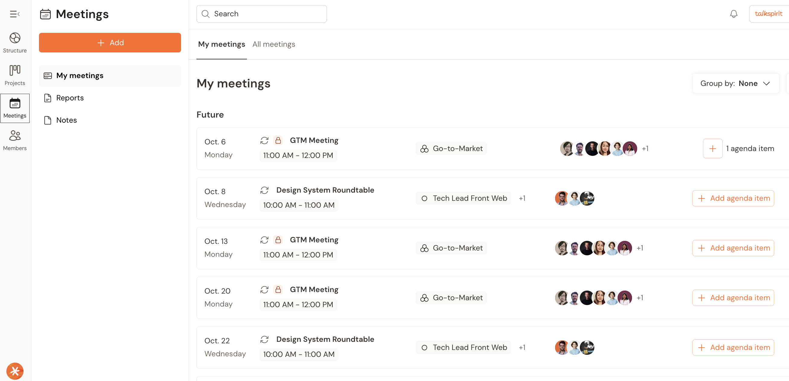 In Talkspirit, your organisational operating system, meetings are not an isolated activity. They are deeply embedded into the way your structure evolves, your teams communicate, and your purpose comes to life.